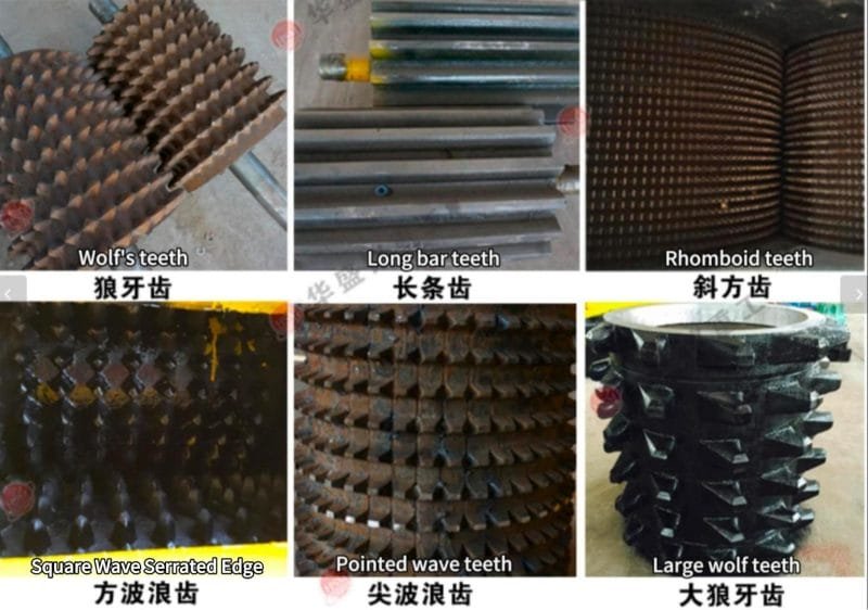 The tooth profiles of coke crushers can be categorized as follows: long-strip teeth, wolf teeth, square wave teeth, pointed wave teeth, oblique square teeth, large wolf teeth (reinforced, enlarged, wear-resistant), and other tooth profiles.