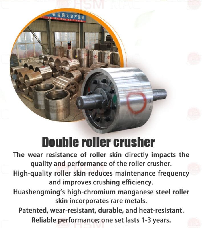 III. Wear-resistant and reliable, ensuring long-term low-cost operation The tailings from tungsten mines often contain strong abrasive minerals such as quartz, feldspar, and pyroxene, which cause severe wear to the equipment. To address this situation, professional manufacturers like Huashengming have developed high-chromium-manganese steel integral cast rolls or tungsten carbide hard alloy surface welding rolls. The surface hardness reaches above HRA86, and the roll life can last for 2-3 years, eliminating the high maintenance costs associated with “monthly parts replacement”. The entire machine is equipped with heavy-duty frames, thin oil lubrication, and multiple seals to ensure stable operation in dusty and humid environments.